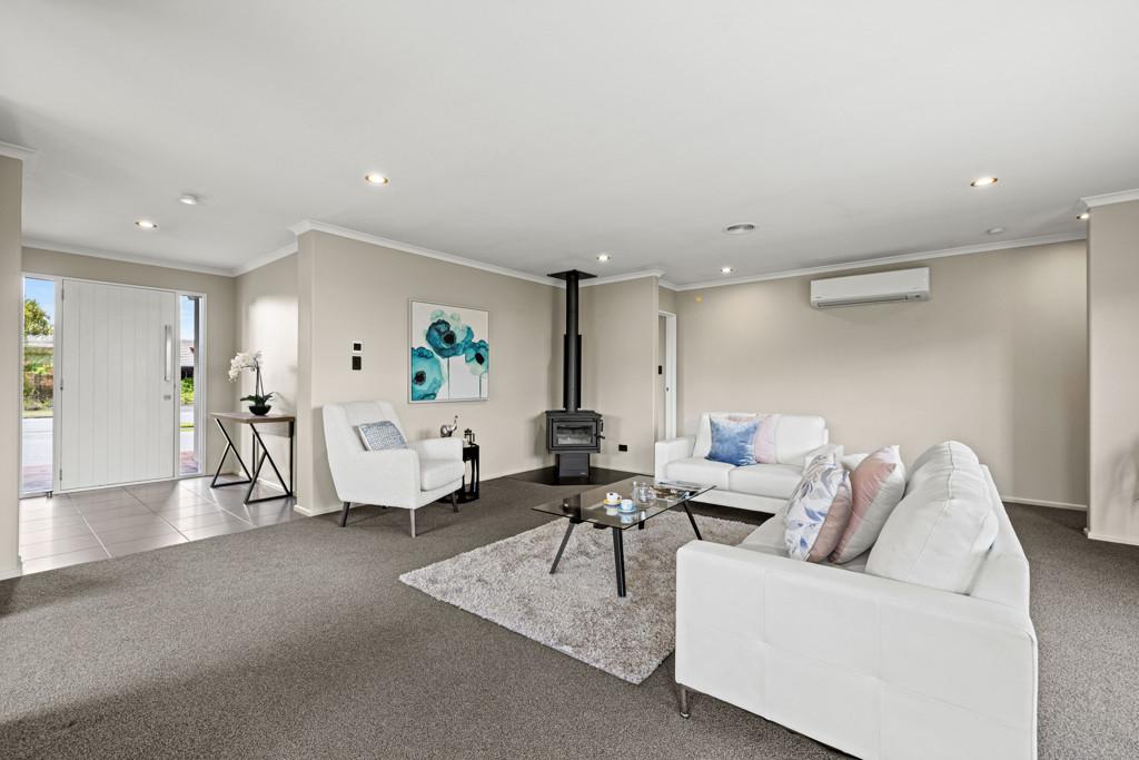 At the heart of the home, open-plan living and dining creates a natural gathering place for family life. In winter, the log fire adds a cosy focal point, perfect for relaxed evenings, while the heat pump ensures effortless comfort through every season. In summer, the seamless flow to the covered outdoor entertaining area makes hosting family and friends easy, offering a relaxed setting for alfresco dining and a natural connection to outdoor play for children.