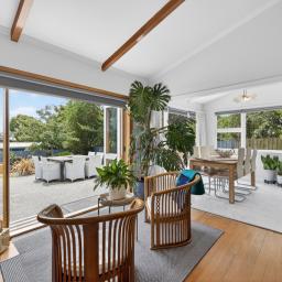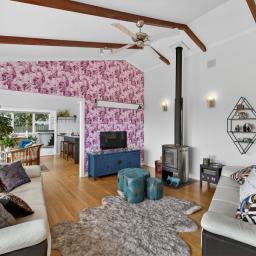 Set privately off the road and bathed in north-facing sun, this exceptional coastal home offers a true entertainer's lifestyle just a stone's throw from the beach. Designed for hosting and relaxing in equal measure, the home opens seamlessly to multiple outdoor zones with a variety of seating options, creating an inviting backdrop for long lunches, summer evenings and year-round entertaining. High ceilings, exposed timber detailing and abundant natural light give the interiors warmth and character, while two living areas and a separate dining room provide space for the whole family to spread out. The second lounge is a true cosy winter retreat, perfect for relaxed evenings!