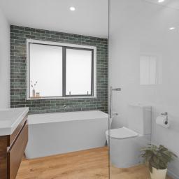 There are three spacious bedrooms with built-in robes, including a main bedroom that opens directly onto the garden, creating a peaceful retreat for parents. Two beautifully tiled bathrooms add a touch of elegance.