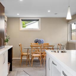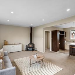 The open plan kitchen and dining area connects easily with the sunny lounge, creating a relaxed space for daily living. A log burner and heat pump help keep the home comfortable through the seasons, whether you're enjoying a quiet morning or winding down in the evening.