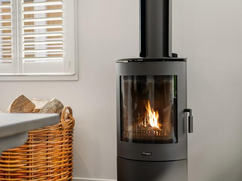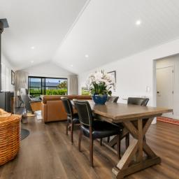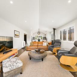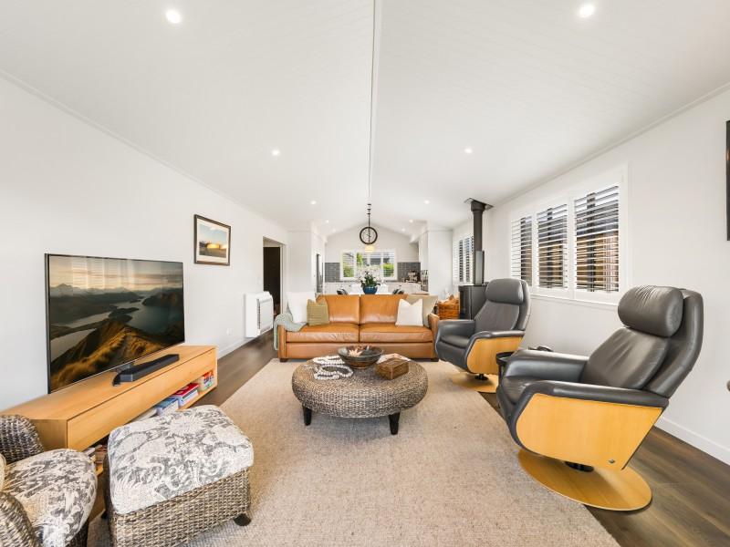 Accommodation comprises two generous bedrooms, each finished to the same exacting standard. The guest bedroom has a double built in wardrobe and is serviced by a beautifully appointed marble look tiled bathroom. The exquisite primary suite offers an exceptionally spacious walk-in wardrobe and a luxurious ensuite featuring matching marble-look tiling, under-tile heating, a double vanity with premium mirrors, a Ceramic King tankless bidet, and shower doors with Diamond Fusion coating for effortless cleaning and long-term clarity. Carefully designed heating solutions include, two Daikin wall-mounted inverter heat pumps, a Daikin floor-standing inverter heat pump, and a Masport Akaroa radiant wood fire, creating warmth, ambience, and flexibility in every season.