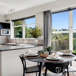 A modern kitchen leads effortlessly through the dining area and into the living space, where the outlook stretches west toward Kapiti Island. Stunning sunsets become part of the daily rhythm here, an ever-changing backdrop that never loses its appeal.