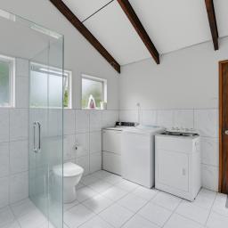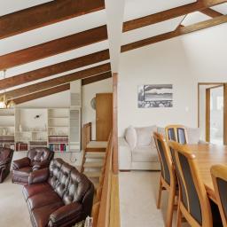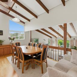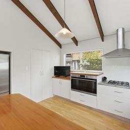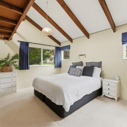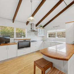 High ceilings and exposed wooden rafters create an immediate sense of warmth and volume throughout the home, while its original features reflect the quality and craftsmanship of the era. The living spaces are generous and versatile, with two distinct zones providing flexibility for modern family living. The combined kitchen and spacious dining area overlooks the lounge, forming a social hub that functions well for everyday family life and entertaining alike, while also offering clear potential for future enhancement.