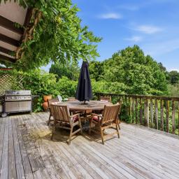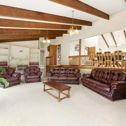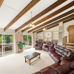 The sunken lounge flows out to a spacious deck, creating an easy connection between indoor and outdoor living. The layout and proportions provide an excellent foundation for transformation.