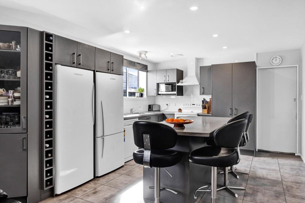 The well-appointed kitchen is a delightful hub, featuring modern appliances, ample storage, and a functional layout that makes cooking a pleasure. Enjoy casual meals at the central breakfast bar.