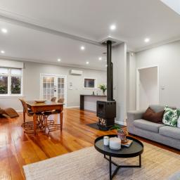 The interior is a study in light and volume, featuring expansive open-plan living and dining areas anchored by glowing timber floors. Modern convenience meets classic charm in the designer kitchen, while the versatile floor plan offers three generous double bedrooms and a dedicated home office. Beyond the aesthetic refresh, the home is engineered for year-round comfort with the efficiency of mains gas, two heat pumps, and the timeless cozy crackle of a wood-burning fireplace.