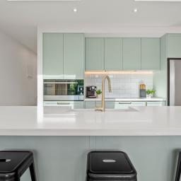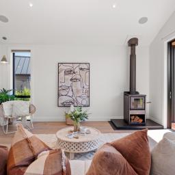 The heart of the home is the north-west facing open-plan living, kitchen and dining area, where skillion ceilings and skylights enhance the sense of volume and light. Designed for both everyday comfort and entertaining, this space features large sliding doors that open to the private garden with mature planting, flooding the home with sun year-round.