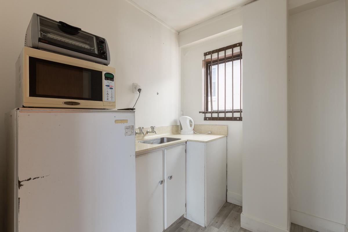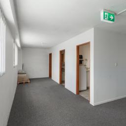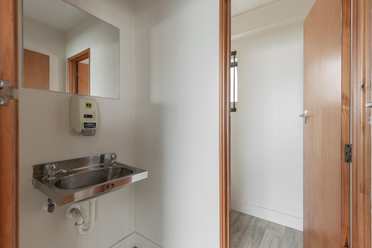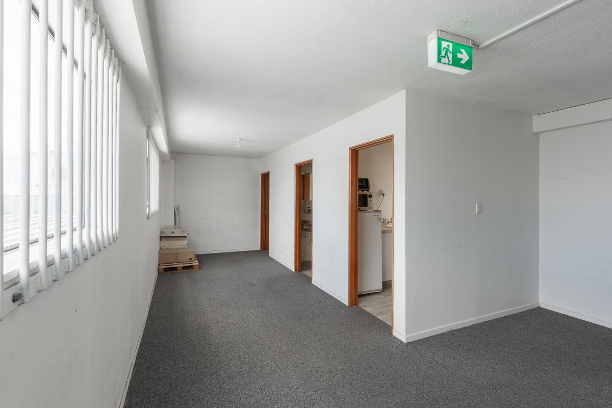 A practical mezzanine level provides bathroom facilities and a kitchenette, creating clear separation for staff amenities or additional operational space.