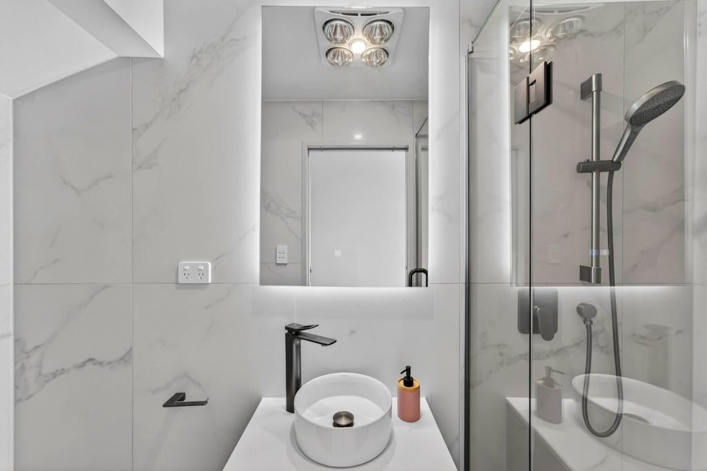 Spread across three well-considered levels, each home offers the perfect balance of space and practicality. The middle level forms the heart of the home, an open-plan kitchen, dining, and living area that connects seamlessly to a large, expansive deck, ideal for entertaining or unwinding in the afternoon sun. A conveniently positioned powder room on this level enhances everyday comfort. The kitchen showcases sleek finishes and Bosch appliances, perfectly blending form and function.