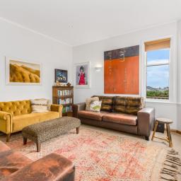 • Dedicated living room featuring a high stud and excellent natural light through large sash windows.