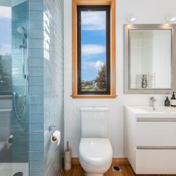 • Second bathroom with modern tiling, a large walk-in shower, and separate bath.