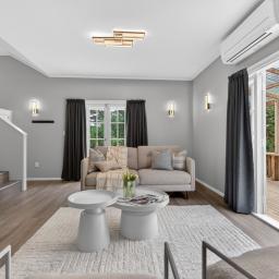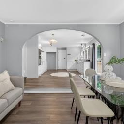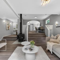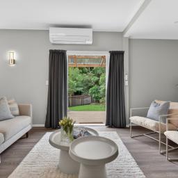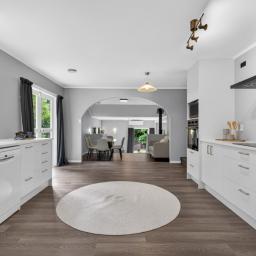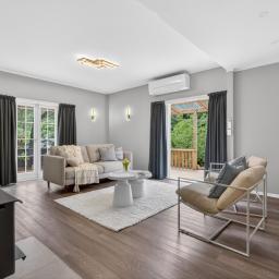 The ground level of the home has been thoughtfully designed for comfortable everyday living and easy entertaining. A spacious lounge features French doors that open out to the wrap-around deck, creating seamless indoor outdoor flow and the perfect spot to relax or host friends. A fireplace provides warmth through the winter months, while a heat pump ensures year round comfort. The layout also includes a designated dining area, a large spacious modern kitchen, a handy study nook, laundry, separate toilet, main bathroom, and new flooring throughout the lower level.