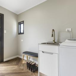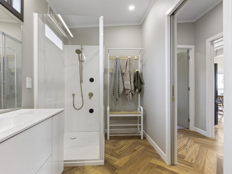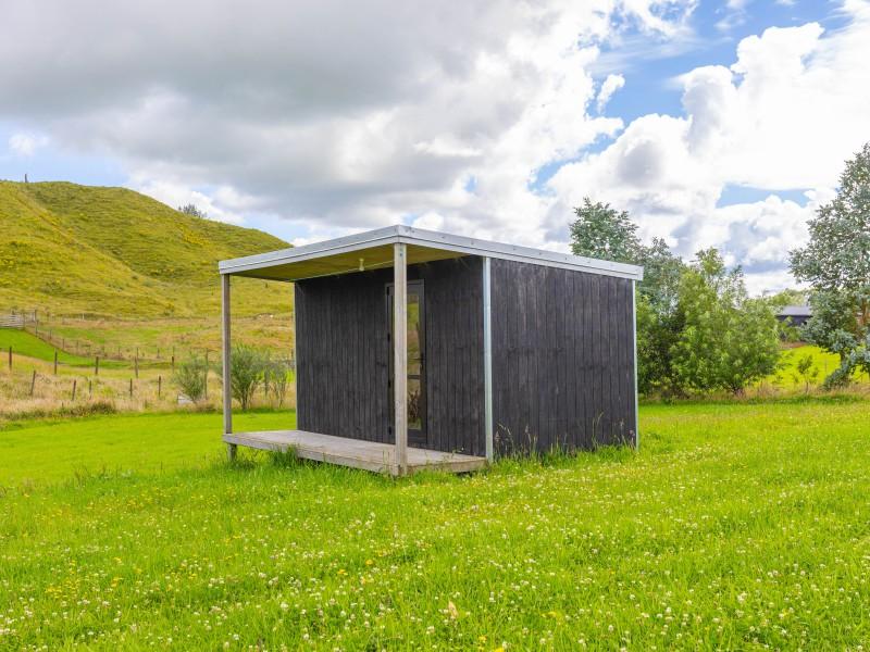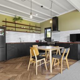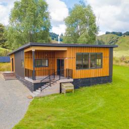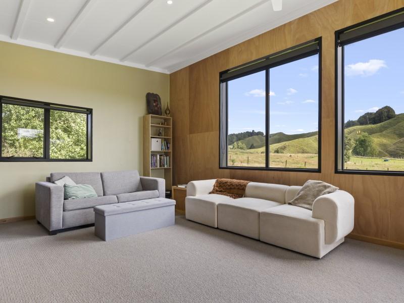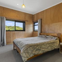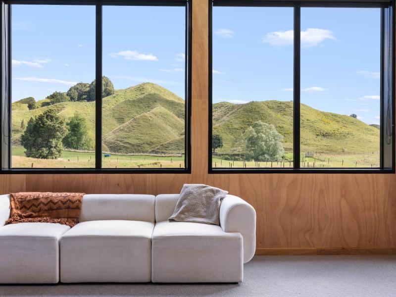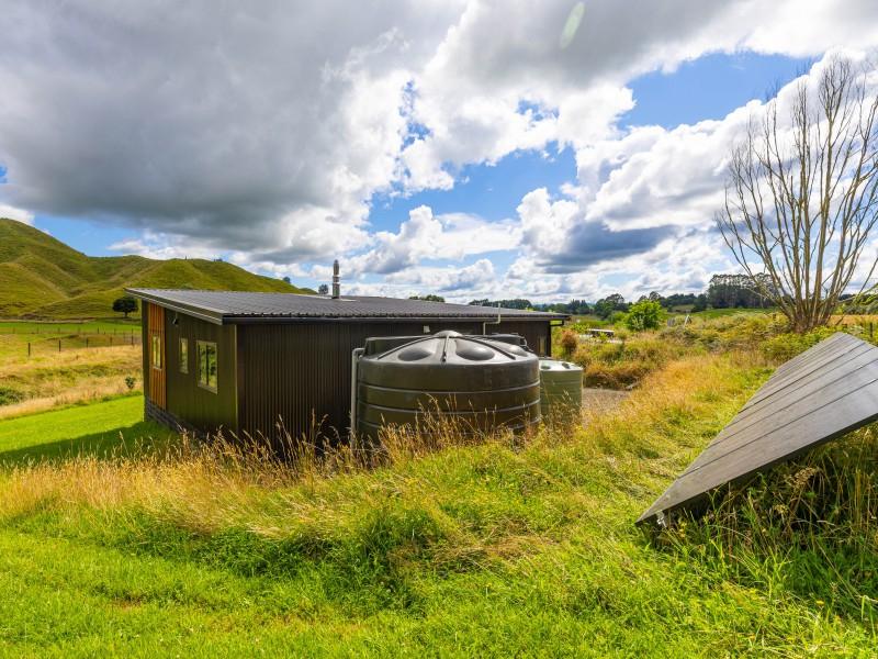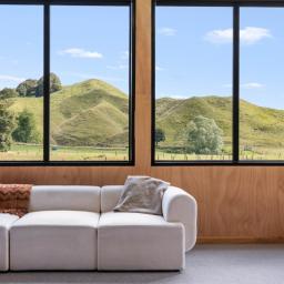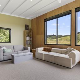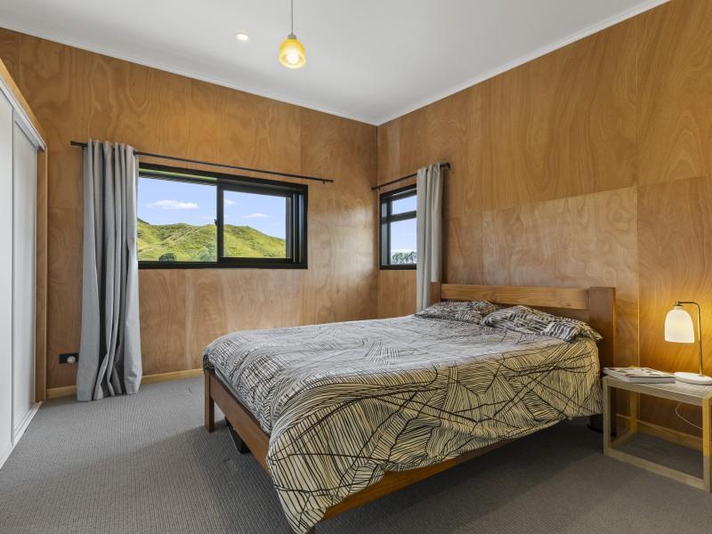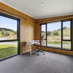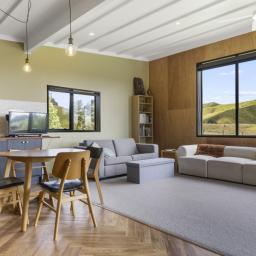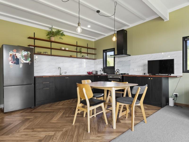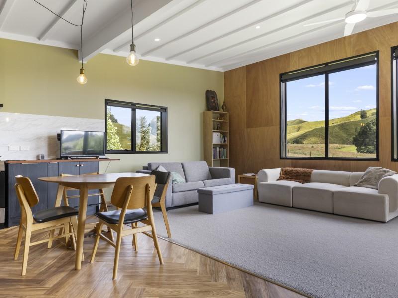 The home showcases contemporary styling and tasteful decor, constructed with modern, low-maintenance materials. Board and batten cladding combined with iron detailing creates strong visual appeal, while double glazing ensures year-round comfort. A log fire (with wetback option) further enhances the off-grid lifestyle, adding both warmth and practicality.