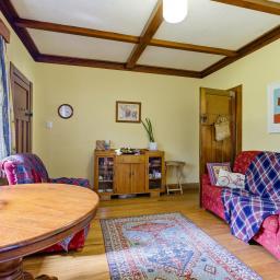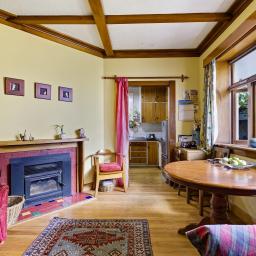 The heart of the home is the kitchen and dining area—compact yet highly functional—where timber ceiling beams and polished wooden floors set a welcoming tone. A wood burner anchors the dining space, providing a cosy focal point for everyday living.
