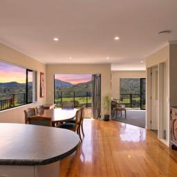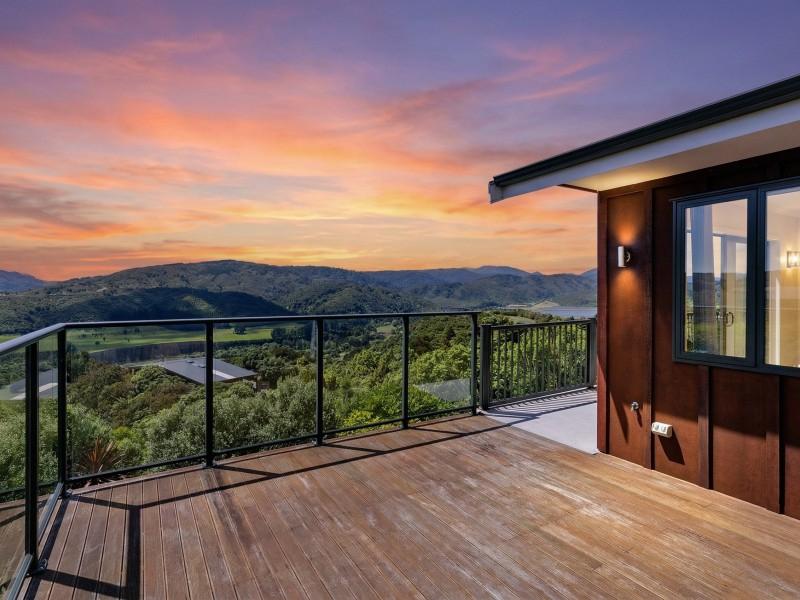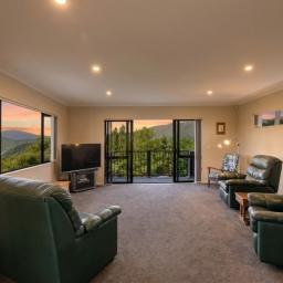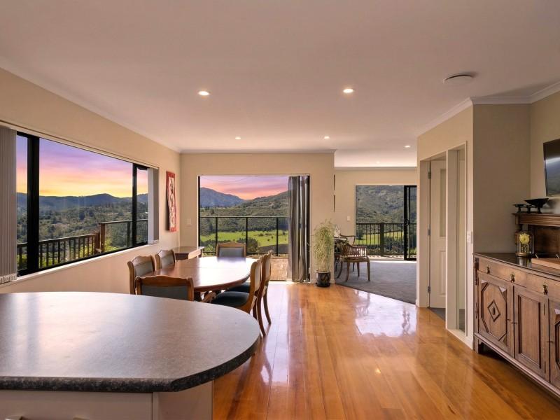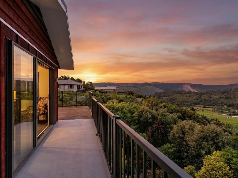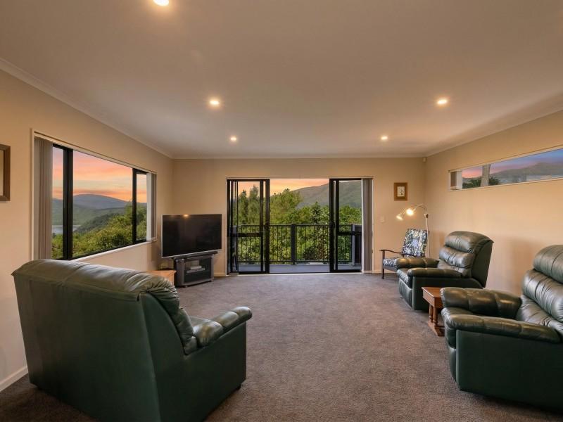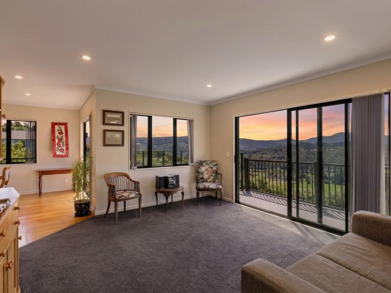 Large sliding doors extend the living outdoors to a sun-soaked deck, where the outlook is simply breathtaking. From here, you can take in uninterrupted views across the Te Marua Golf Course, the Twin Lakes, and out to the Tararua Ranges — a stunning backdrop that changes with the seasons and brings a constant sense of calm.