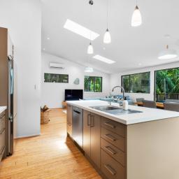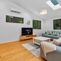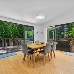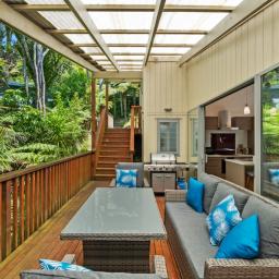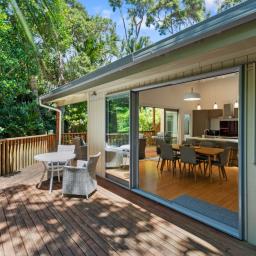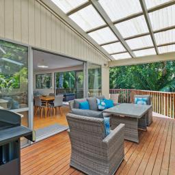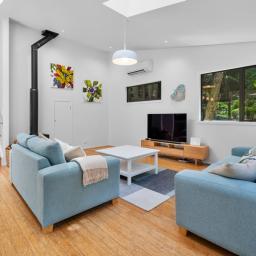 Set in a tranquil bush location, you'll feel connected to nature while remaining just moments from Palm Beach and Ostend shops. Skylights invite natural light, creating an open, airy atmosphere throughout the home. Outdoor living is a joy with entertaining decks that offer partial cover, perfect for al fresco dining or a peaceful morning coffee.