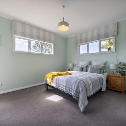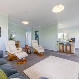 The light filled living areas and main bedroom flow to wrap around decks to soak up the views over the subtropical gardens and rural land to Maungarahu Rock, Tokatoka and beyond, simply stunning. The various decks are a wonderful places for the morning coffee or just chilling out reading a book in the shade.