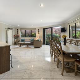 At the heart of the home lies a spacious open-plan kitchen, dining, and living area, designed to maximise natural light and connection to the outdoors. The kitchen is both functional and stylish, ready to cater for family meals or entertaining guests. Flowing seamlessly from the living areas are three separate outdoor entertaining spaces, including a beautifully landscaped garden with a built-in firepit, perfect for relaxing, entertaining, or enjoying family gatherings in style. This space provides the ideal setting for morning coffee, evening drinks, or simply unwinding surrounded by serene greenery.