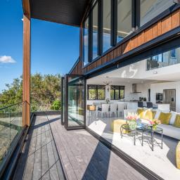 Expansive north-facing decking spans the full width of the home, seamlessly connecting indoor and outdoor living while capturing sun and scenery throughout the day.