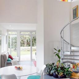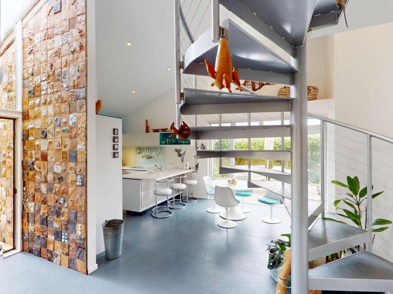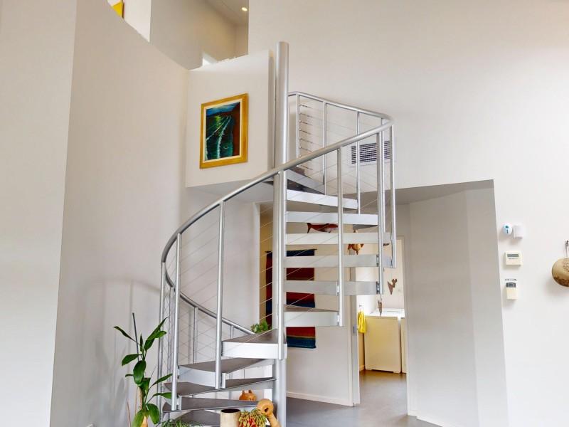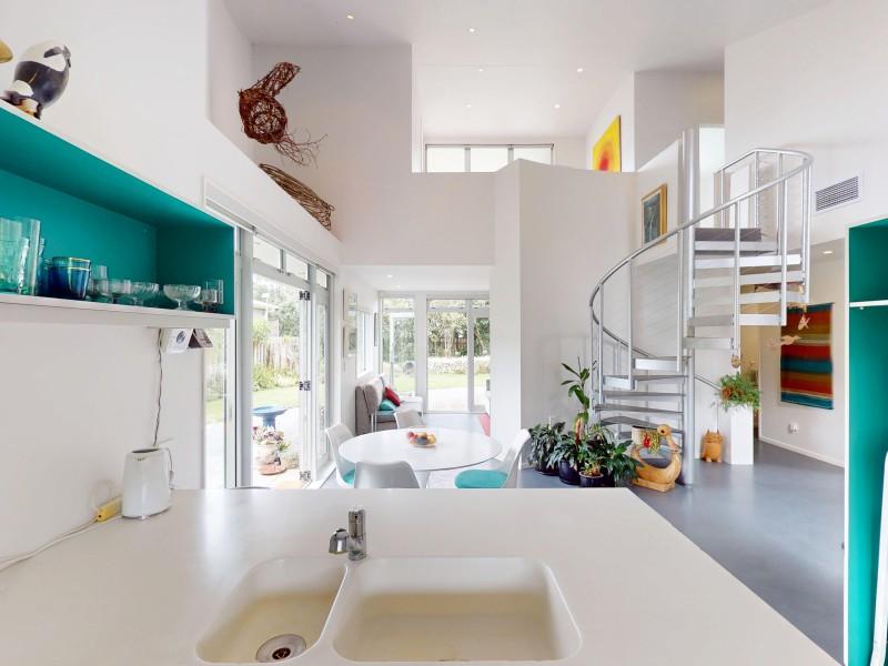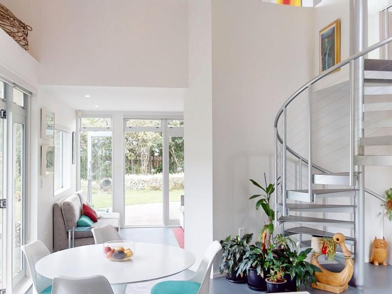 Upstairs, a striking spiral staircase leads to a second living space with a hard-wearing rubber tile floor, private deck, and lovely eastern views. The property is fully fenced and features well-designed gardens to both the east and west, plus a welcoming driveway leading to a double garage.