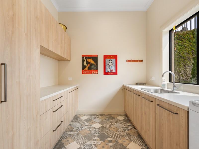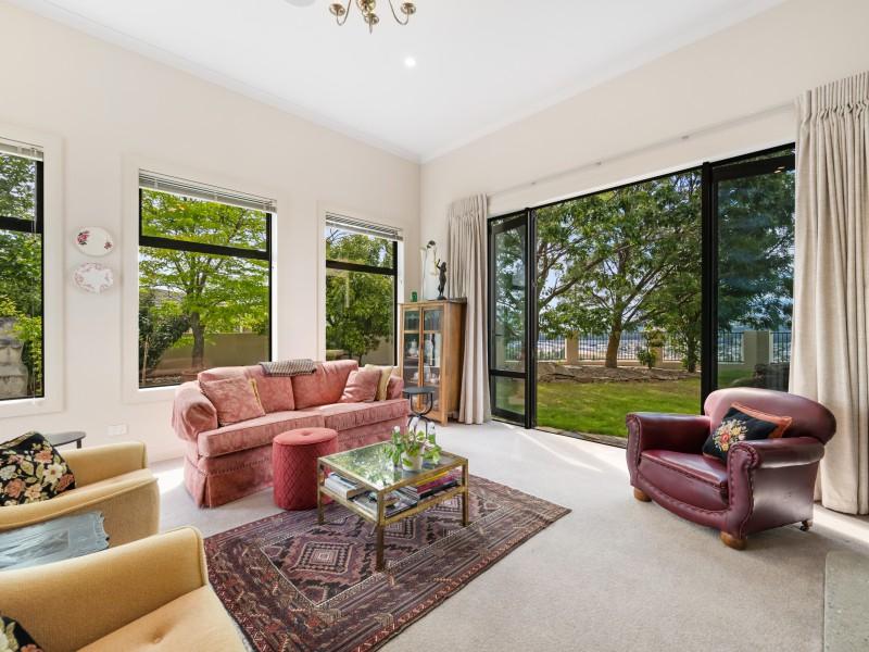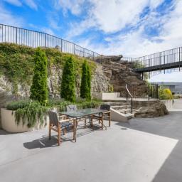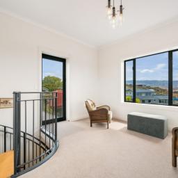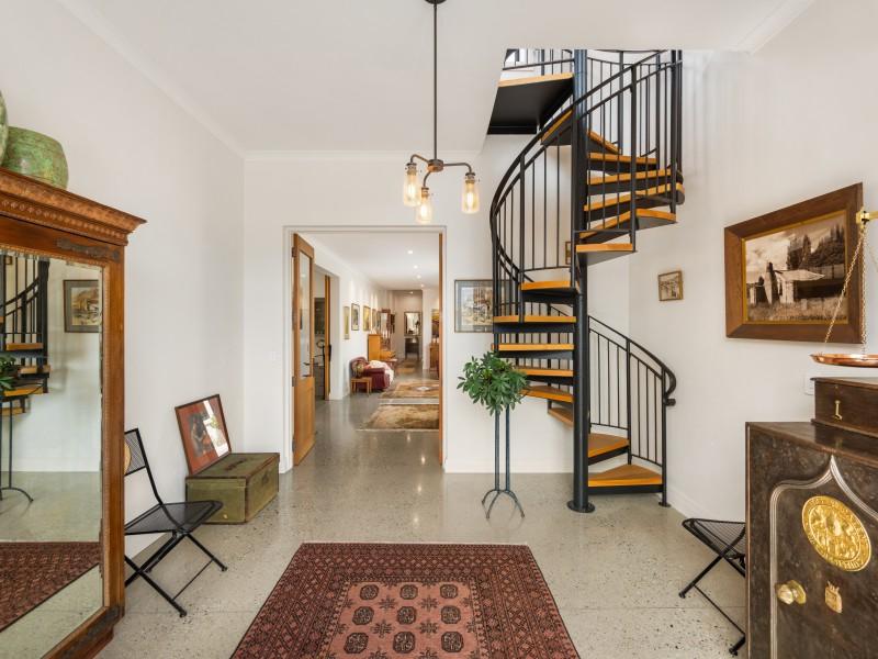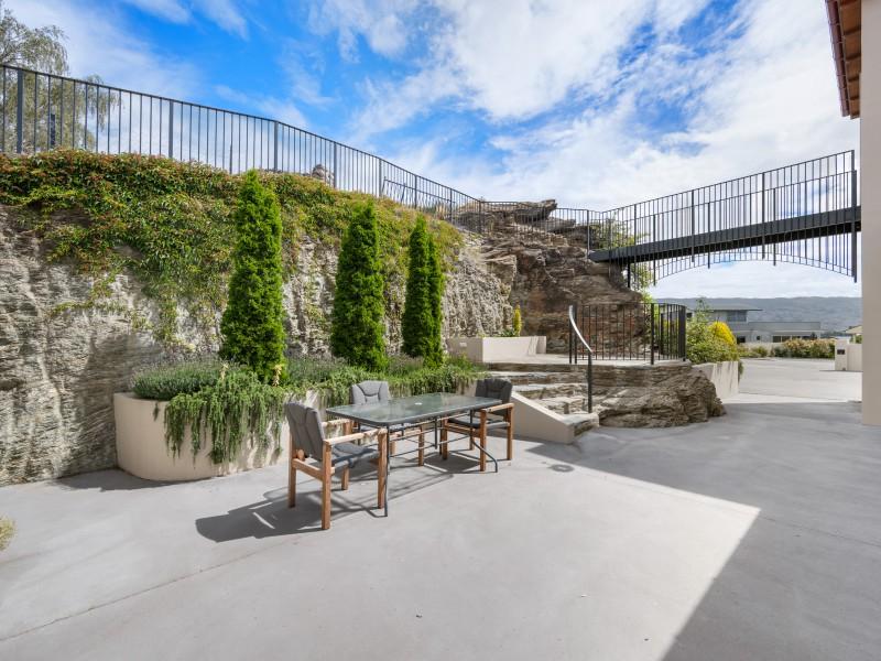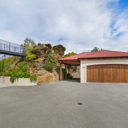 A formal entranceway welcomes you into 4 Hawkdun Place, flowing through to a grand gallery-style hallway - an impressive space ideal for showcasing artwork and connecting seamlessly to all adjoining rooms. From the entry, striking spiral stairs ascend to the tower room, a tranquil retreat for reading or meditation. From here, a bridge leads to an elevated schist garden, offering a peaceful vantage point to explore and enjoy the surrounding landscape.