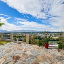 Externally, the home is finished in timeless schist and plaster cladding, complemented by a covered concrete verandah, schist paving, feature walls, automated irrigation, and established landscaped gardens. A separate double garage and carport, along with extensive paved areas, complete the property.