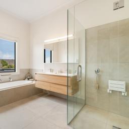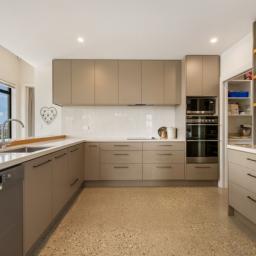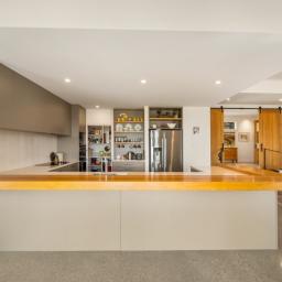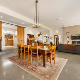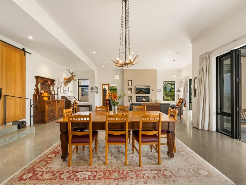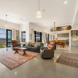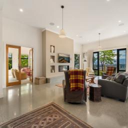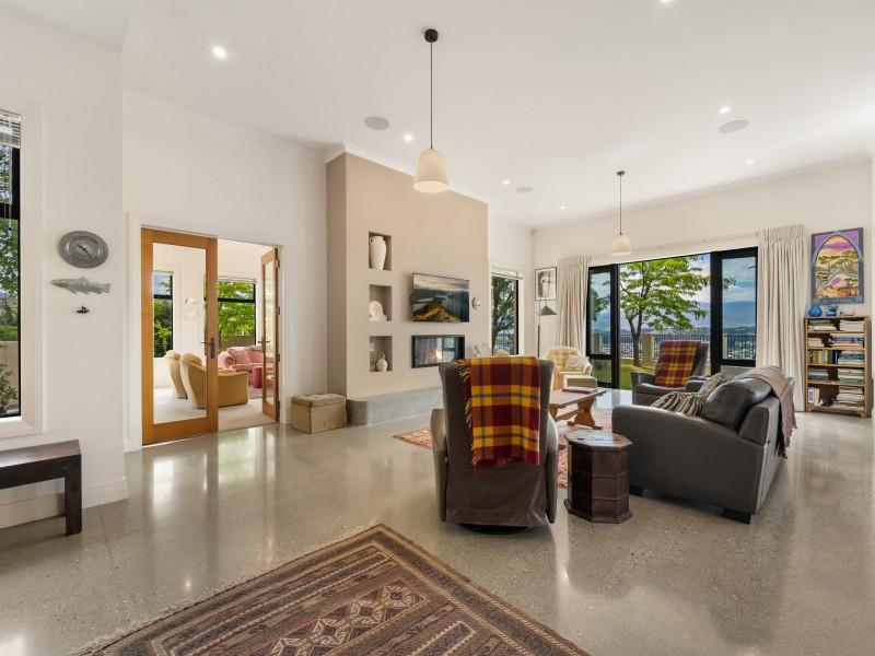 The main living areas are anchored by expansive polished concrete floors, complemented by luxurious underfloor heating that enhances both comfort and style. High-pitched ceilings amplify the sense of space and natural light, while floor-to-ceiling glazing frames the ever-changing scenery beyond.