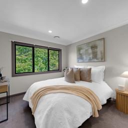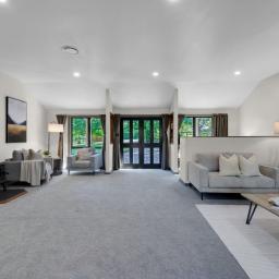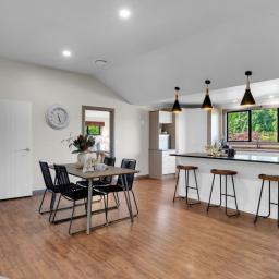 Living and dining areas are well proportioned and flow naturally to the outdoors, making entertaining straightforward while also allowing quiet enjoyment of the setting. Large windows invite natural light and frame the outlook, reinforcing the home’s relaxed and welcoming atmosphere.