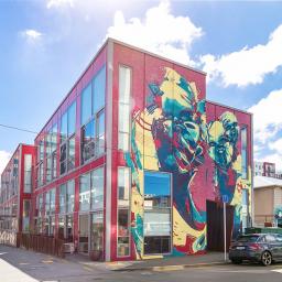 - Second-floor position in a well-known low-rise building with a bold street-art mural