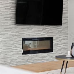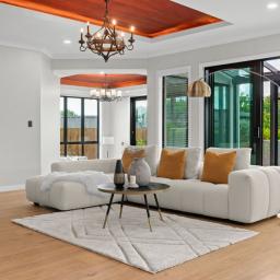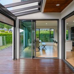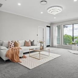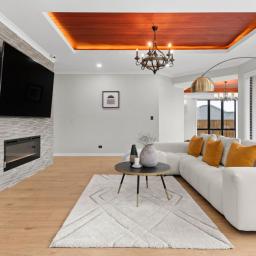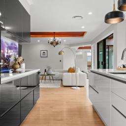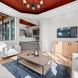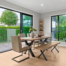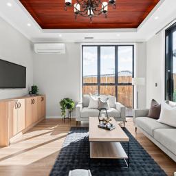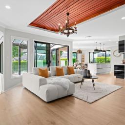An electric fireplace is integrated into the main living zone, adding seasonal ambience and visual depth. The principal living areas are enhanced by recessed feature ceilings with timber inlay, softly illuminated by integrated LED lighting. This layered ceiling detail adds warmth and depth without excess. Both ground-floor living rooms and the dining area connect seamlessly to a sheltered alfresco, where a skylight introduces natural light while remaining protected from prevailing winds. A step-down formal lounge provides separation and intimacy, defined by clean lines and refined ceiling detailing.
