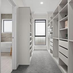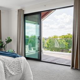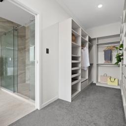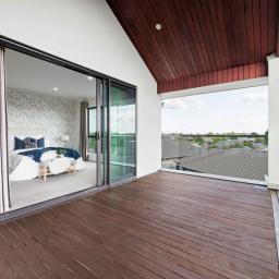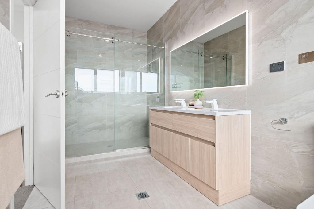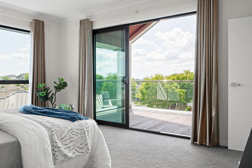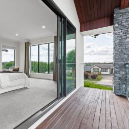 Upstairs introduces a quieter, more private layer of living. A third living space provides separation from the main entertaining zones below, complemented by a dedicated office area ideal for work-from-home or study. Two master suites are positioned on this level, each opening to its own private balcony and enjoying walk-in wardrobes and luxurious, fully tiled ensuites with oversized showers. Elevated views extend toward the Hakarimata ranges, reinforcing the sense of space and retreat.