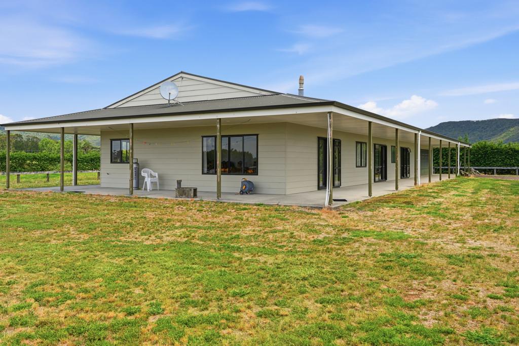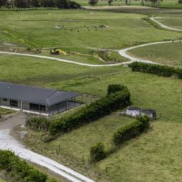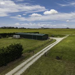 Modern 4-bedroom house internal access. Implement shed 12m x 32m long (approx) in 6 bays with concrete floor and power.