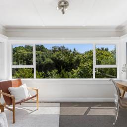 Inside, the generous living area is bathed in natural light and offers ample space for relaxing and dining, all while capturing views out toward Evans Bay, Lyall Bay and beyond. A charming sunroom extends from the main lounge, enjoying the same outlook and creating an ideal playroom, second living area, or peaceful retreat. Sliding windows open seamlessly to the deck, inviting in the summer breeze.
