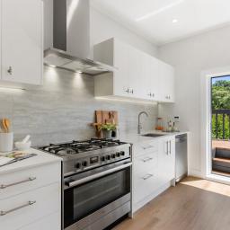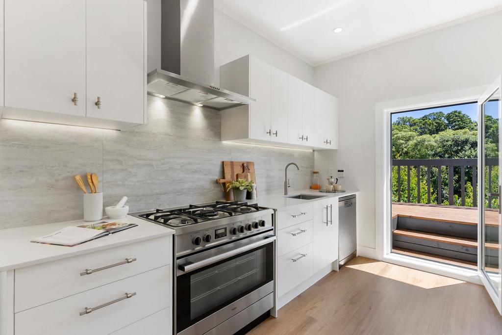 The sleek, modern kitchen is set separately, offering excellent storage, contemporary finishes, and easy flow to the sun-drenched deck. From here, enjoy an elevated outlook across the beautifully landscaped section, providing a private, leafy backdrop perfect for everyday living and effortless entertaining.