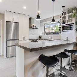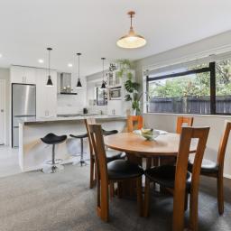 - Modern kitchen with a breakfast bar, ample cupboard space and dedicated dining room