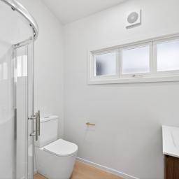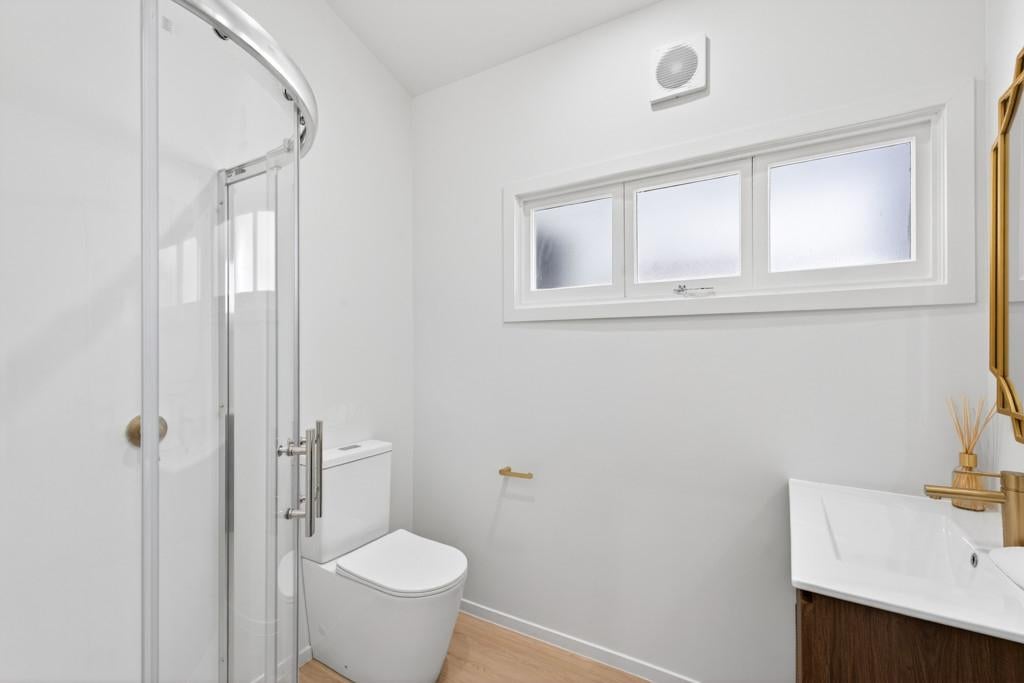 The fully renovated bathroom features a large corner shower and toilet, adding modern functionality for the whole family. New blinds, neutral walls, and warm flooring flow seamlessly through every room, reinforcing the home's complete transformation.