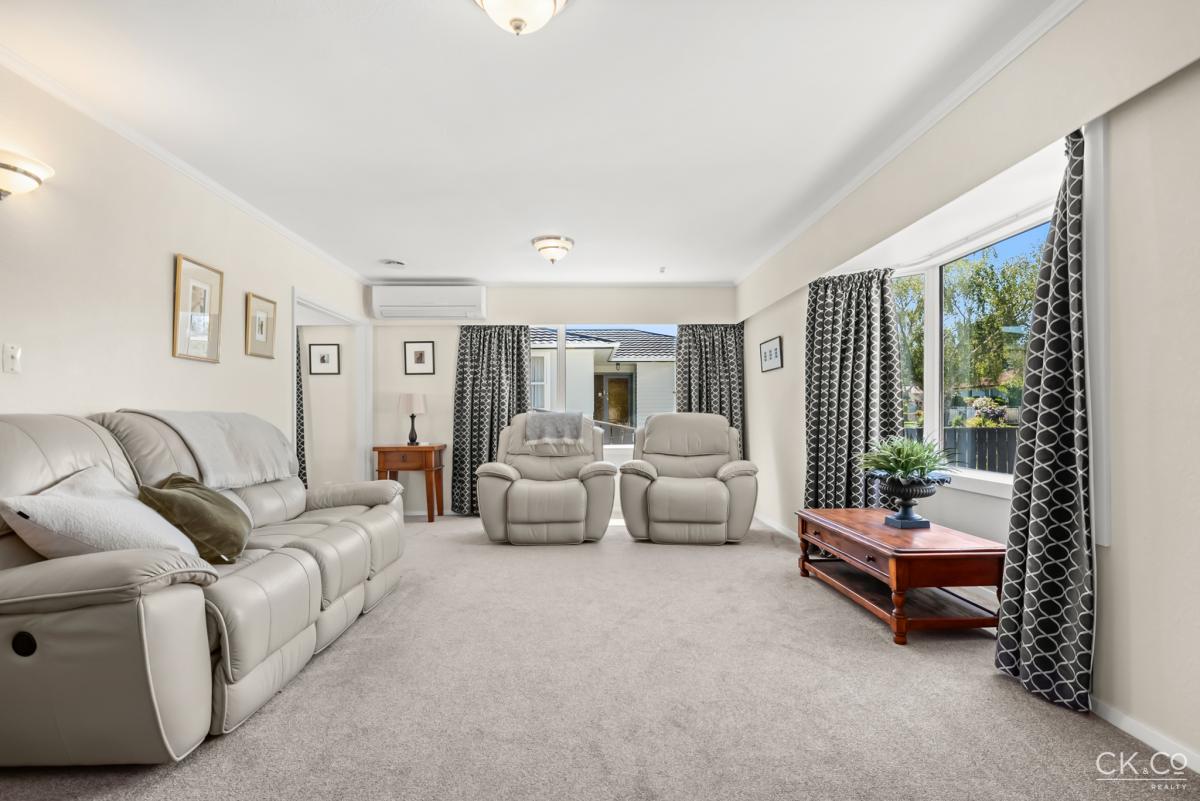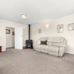A separate lounge provides a cozy retreat, complete with a gas wood fire, while two heat pumps ensure year-round comfort. The large dining area flows effortlessly outdoors through double doors, creating a seamless indoor-outdoor connection.
