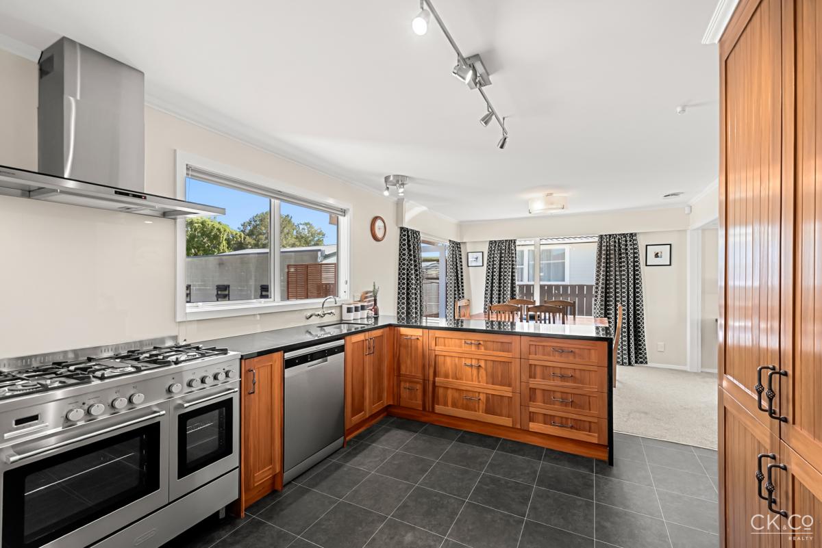 At the heart of the home sits a fabulous timber kitchen, showcasing granite benchtops, a large double oven, and a gas cooktop — perfect for those who love to cook and entertain.