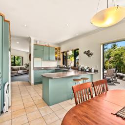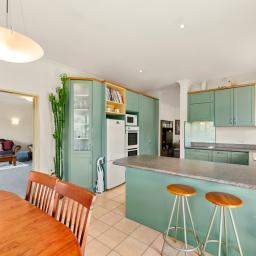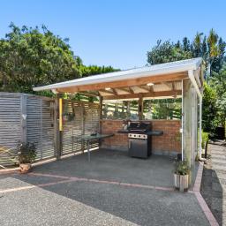 The kitchen is the true hub of the home, complete with a dishwasher and double wall ovens, flowing seamlessly to the dining area for everyday family meals or larger gatherings. Two separate living spaces provide flexibility for growing families – one warmed by a wood burner and heat transfer system, both opening through to a private courtyard. This covered BBQ space, with a large adjacent courtyard area, is ideal for relaxed weekends, birthday parties, and long summer evenings.