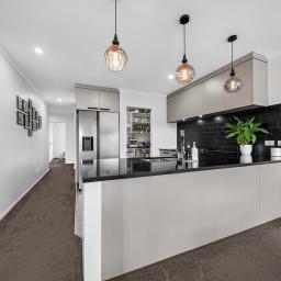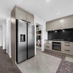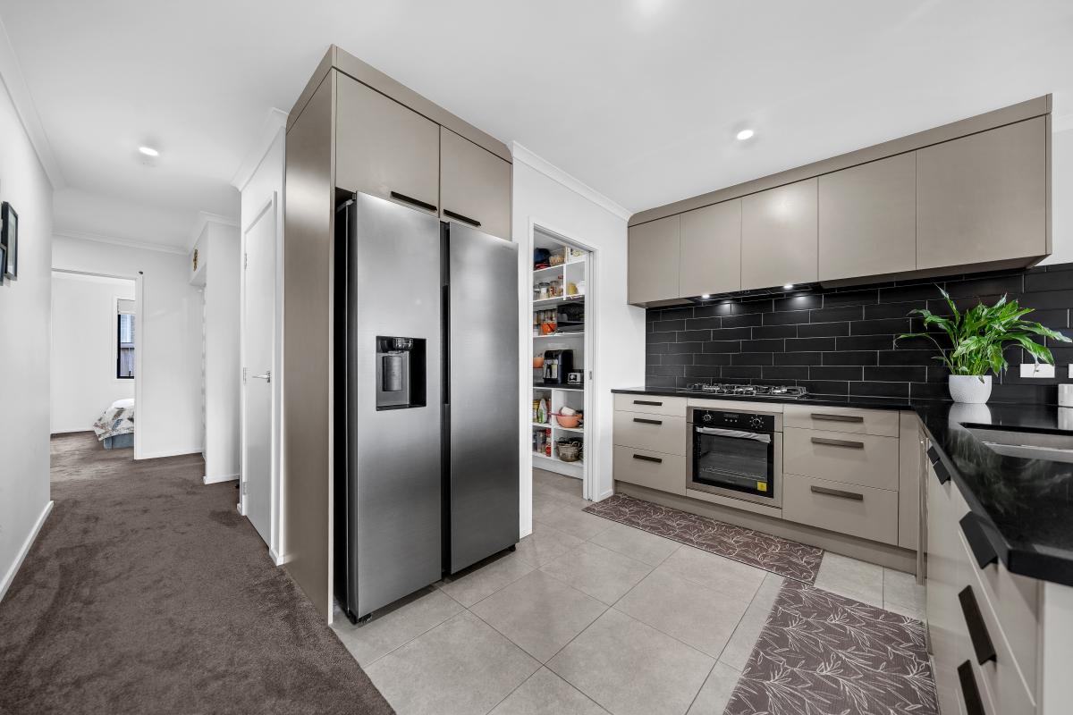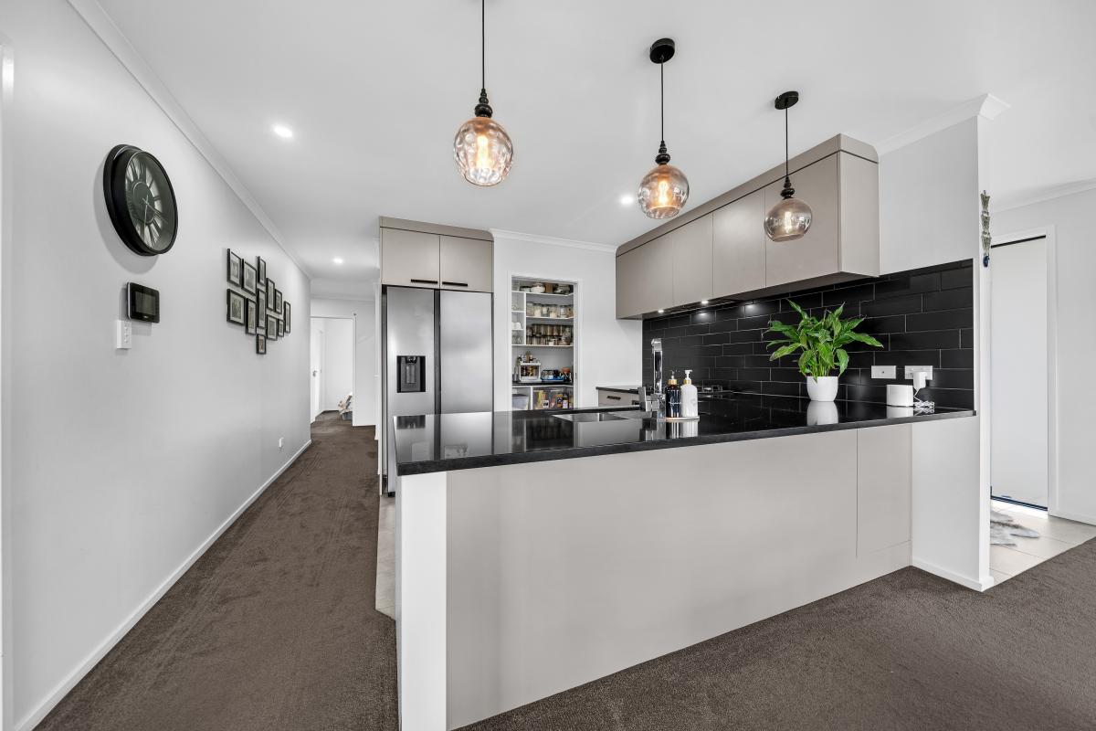 The heart of the home is the open-plan kitchen, living, and dining area, thoughtfully laid out for both everyday living and entertaining. The kitchen is a standout, featuring a gas cooktop, ample bench and storage space, and a generous walk-in pantry—ideal for busy households and keen cooks alike.