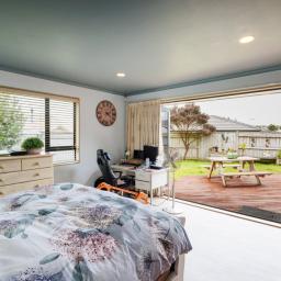 The main bedroom enjoys an ensuite with shower, vanity and toilet, walk-in wardrobe, and bi-fold doors opening to the outdoors
