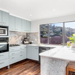 The newly completed kitchen is both stylish and functional, showcasing stone benchtops, sleek cabinetry, quality appliances and a sociable breakfast bar that naturally becomes the heart of the home.