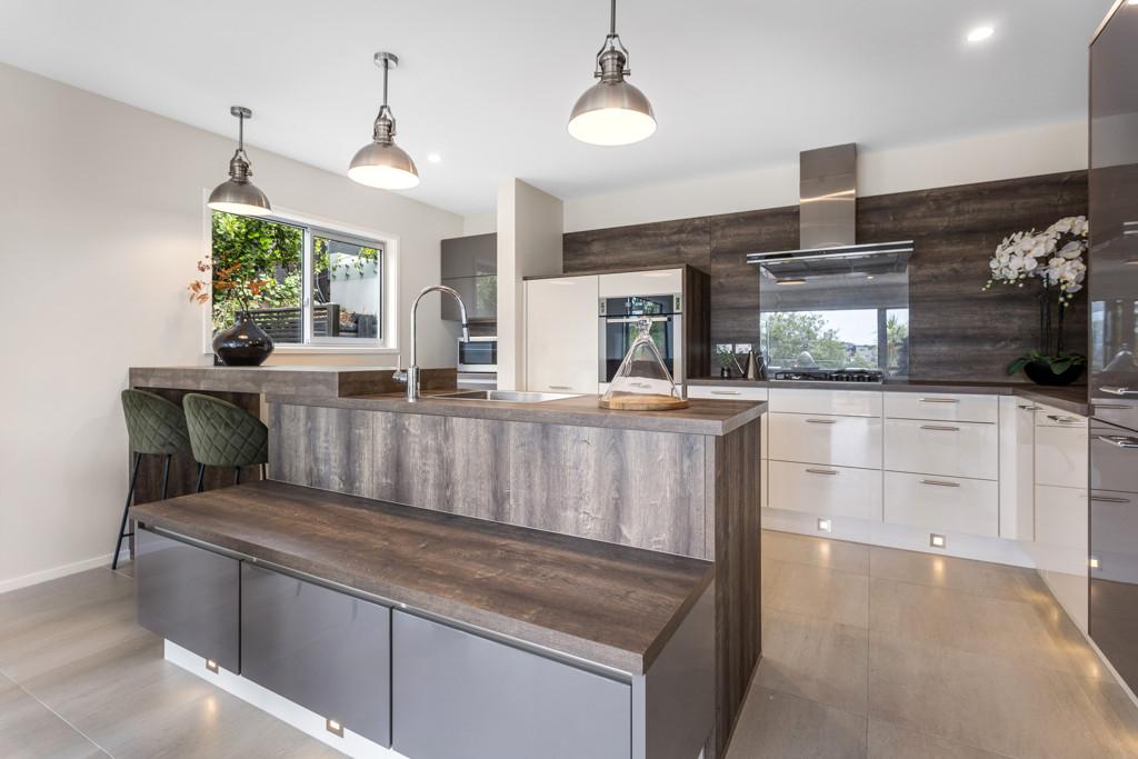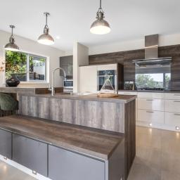 Clad in a warm combination of cedar and plaster, the home presents a confident modern profile that sits naturally within its elevated setting. Inside, a bespoke Palazzo kitchen reflects European design influence, with integrated appliances, gas cooktop and a layout that connects seamlessly to open-plan living and entertaining spaces including a spacious deck with built in seating.