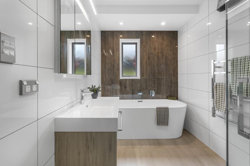 Four bedrooms and two bathrooms are arranged across two levels, offering flexibility for family living, guests or work-from-home options. The primary suite includes a walk-in wardrobe and ensuite, while the family bathroom continues the home's commitment to quality with a tiled shower and freestanding bath.