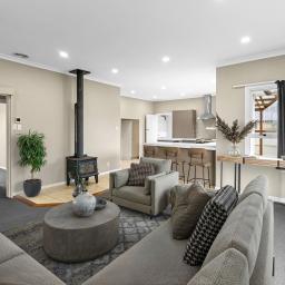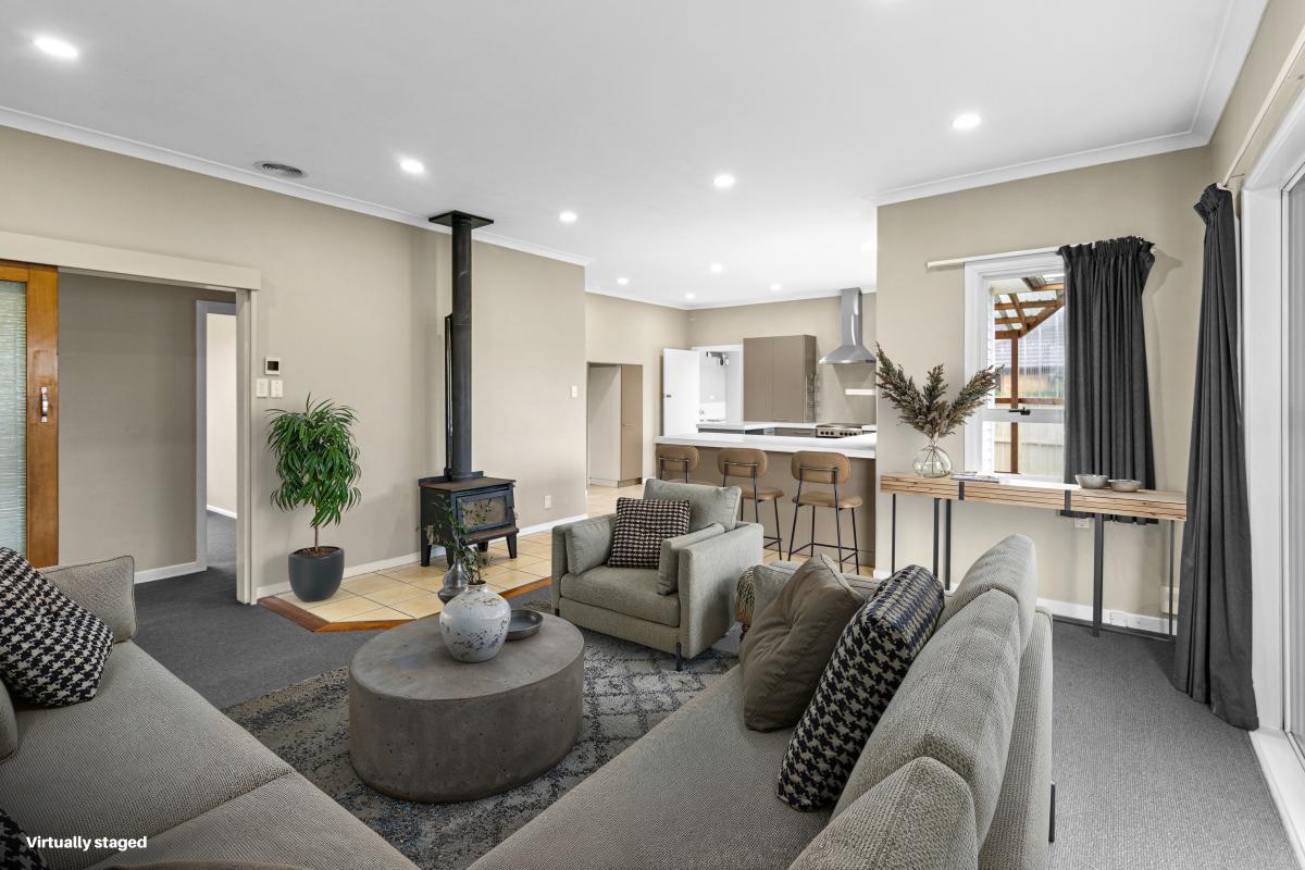 Inside, the layout is ideal for families or those needing work-from-home flexibility, with light-filled bedrooms and north-facing living spaces that enjoy great natural warmth. A freestanding woodburner in the lounge paired with a heat transfer system keeps the home cosy through winter.