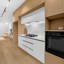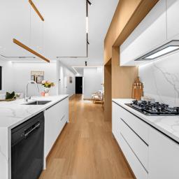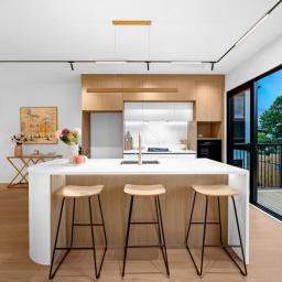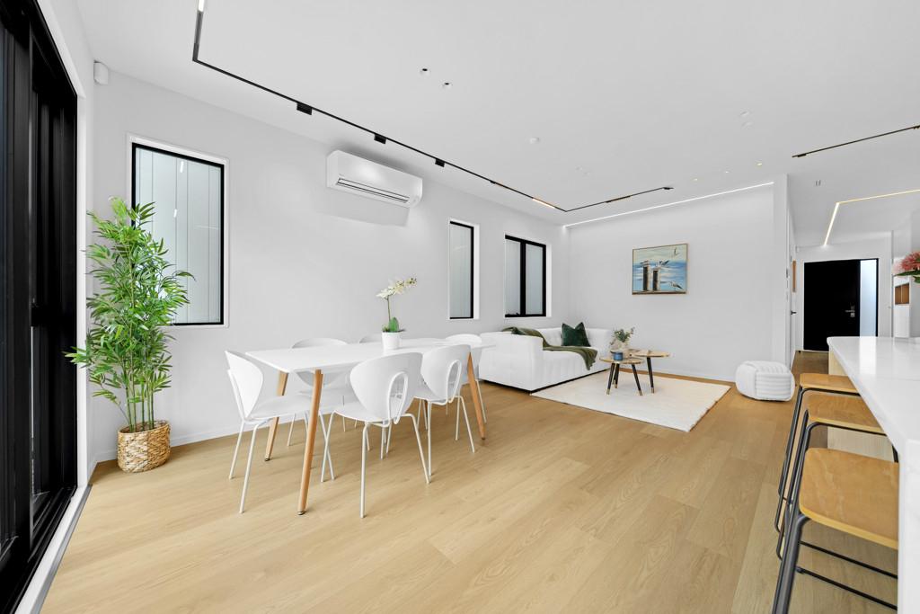 • Open-plan kitchen equipped with premium Bosch appliances, including a gas cooktop.