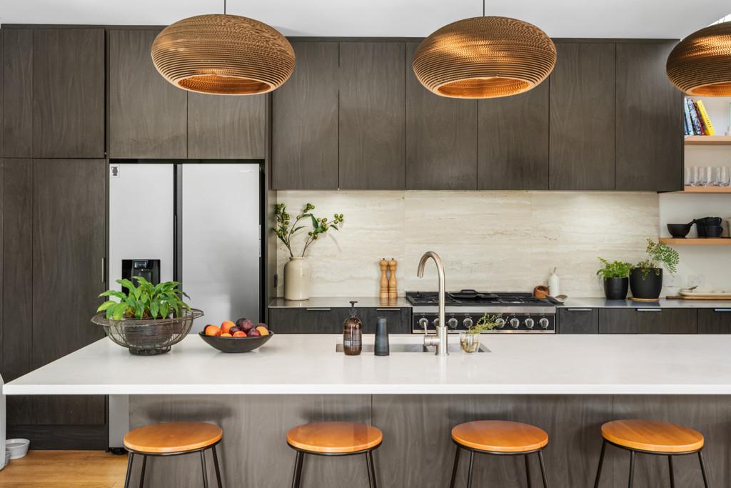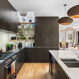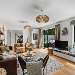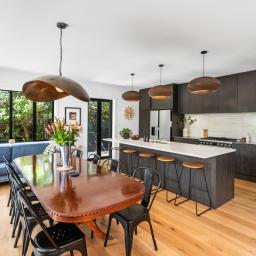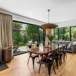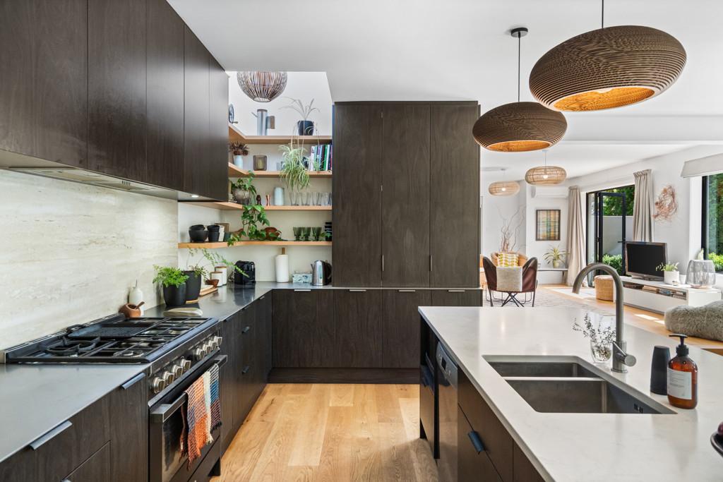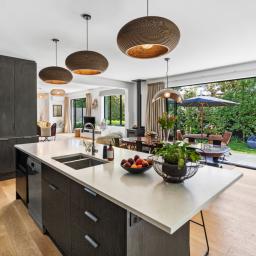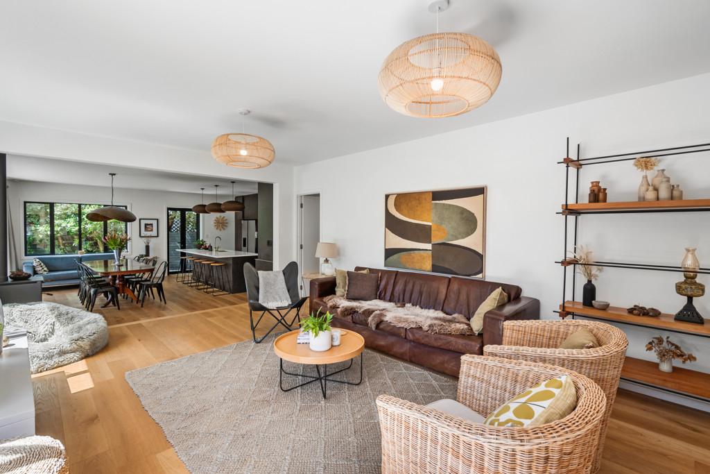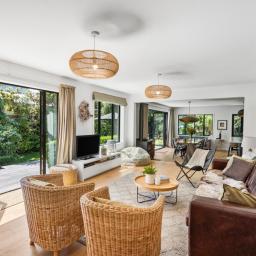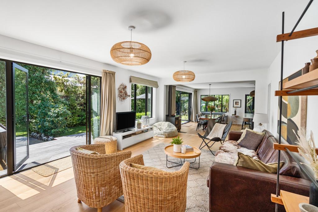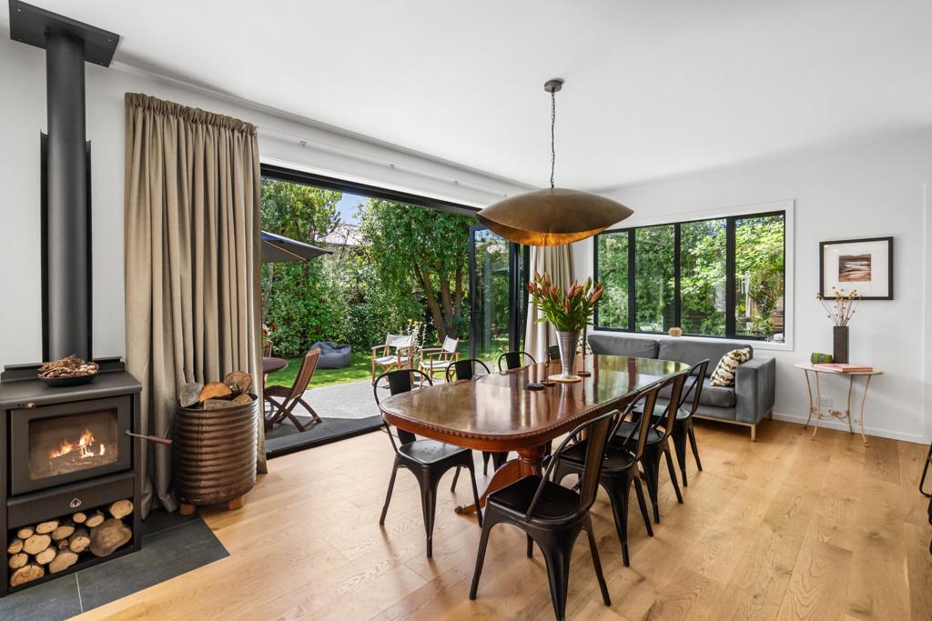 At the centre of the home, the kitchen and living environment form a true design focal point. The statement kitchen, defined by sleek cabinetry, generous bench space and a substantial island, anchors the open-plan living and dining zones, creating a natural gathering place for both everyday family life and entertaining. Large openings draw natural light deep into the living spaces while strengthening the connection to outdoor living and garden surrounds. A log burner and heat pump introduce warmth and atmosphere, enhancing comfort through every season and reinforcing the home's welcoming, lived-in feel.