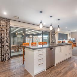 At the heart of the home is a superb chef’s kitchen, complete with engineered stone benchtops, a generous island, and a vibrant splashback. Quality appliances include induction cooking and a double oven, complemented by the luxury of a well-appointed Butler’s pantry — ideal for both everyday living and entertaining.