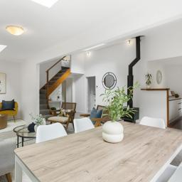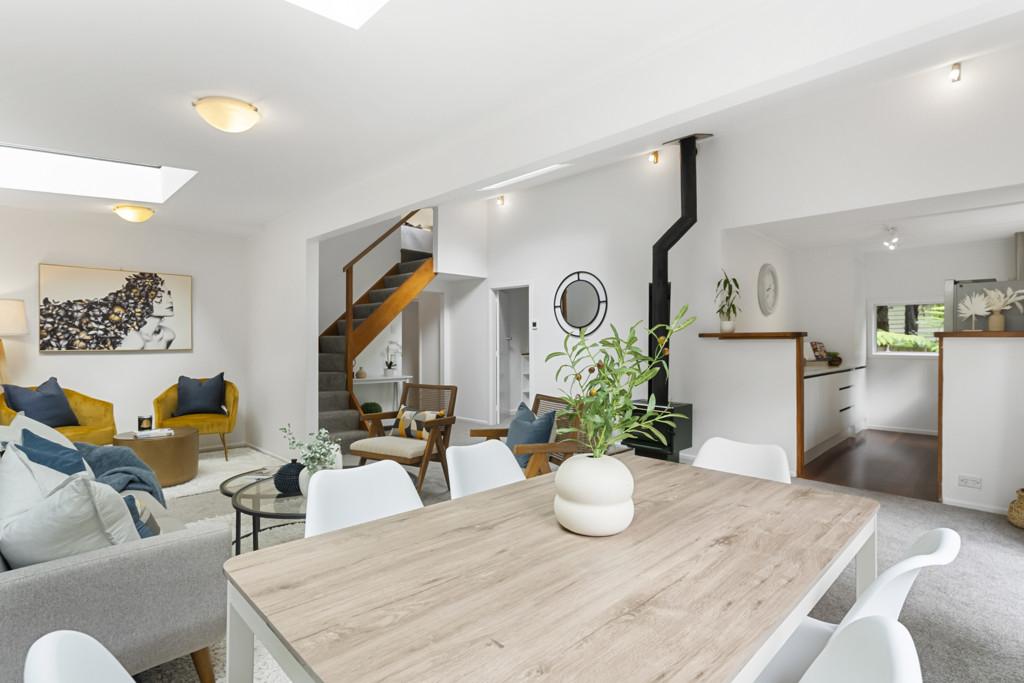 Open plan dining and lounge with a grunty wood-burner sitting centre stage. Double sets of French doors open to a large private BBQ deck where you'll overlook tranquil native bush where the tui and kereru socialise. Follow the handcrafted boardwalks and cross a charming bridge to reveal a breathtaking surprise, a sunny, flat lower garden framed by a gently babbling creek-your own private nature reserve and the ultimate playground for children, gatherings, or peaceful reflection, (a yogi's dream).