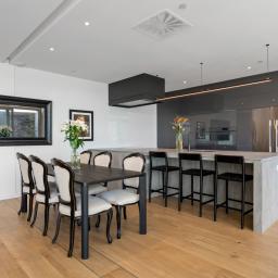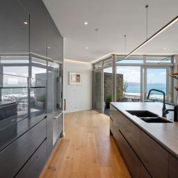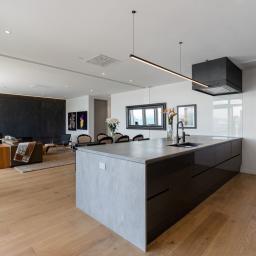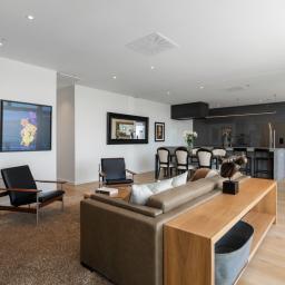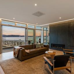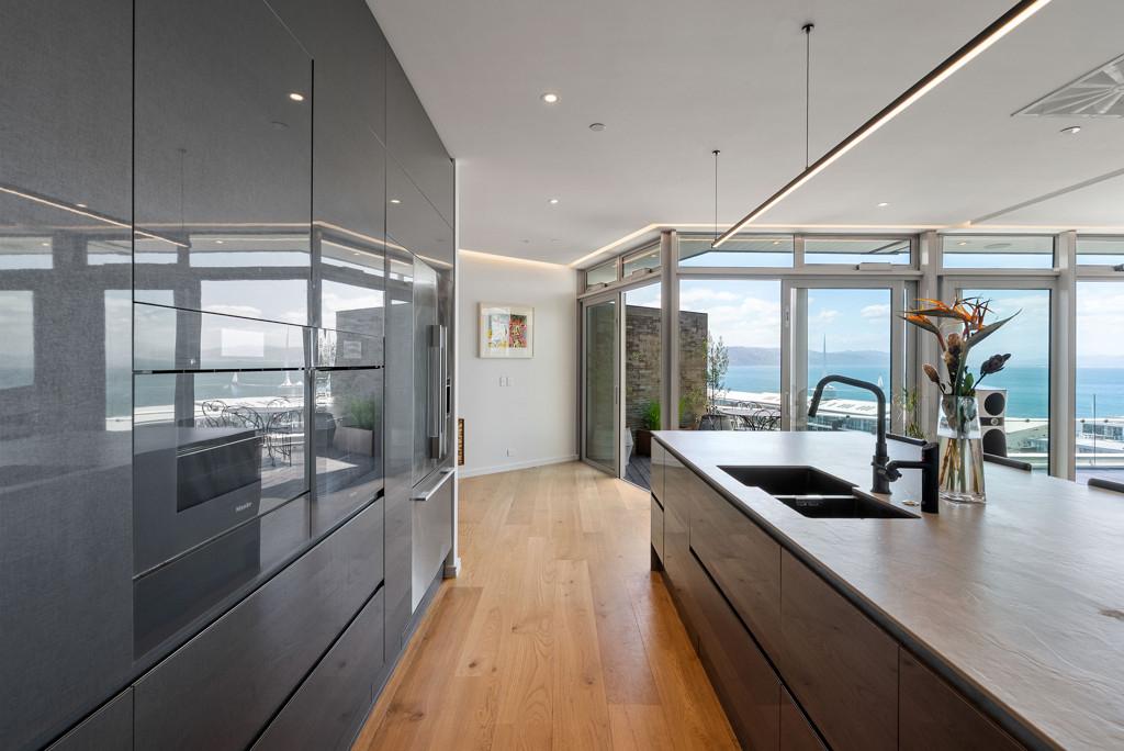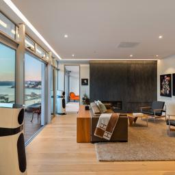 The apartment opens to a generous foyer with immediate sea views, drawing you through to the designer kitchen and spacious open-plan living. An entertainer's dream, the large breakfast bar, Escea fireplace, and full-width glazing form the heart of the home, while multiple alfresco areas provide the perfect setting for waterfront dining and relaxation.
